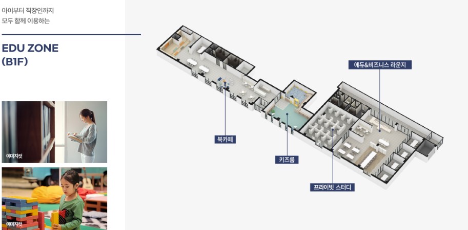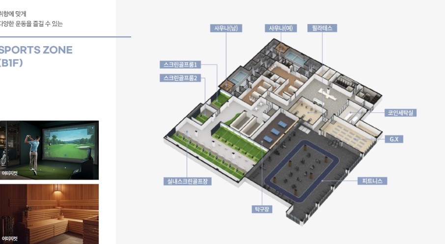 - 커뮤니티 시설: 피트니스센터, 실내 골프연습장, 독서실, 작은도서관, 어린이집, 키즈카페, 맘스카페 등 다양한 시설이 마련.