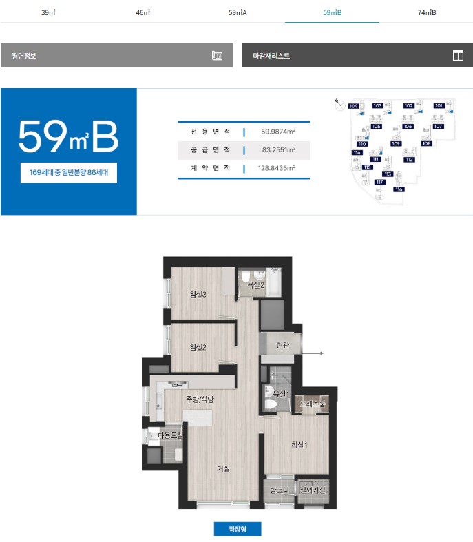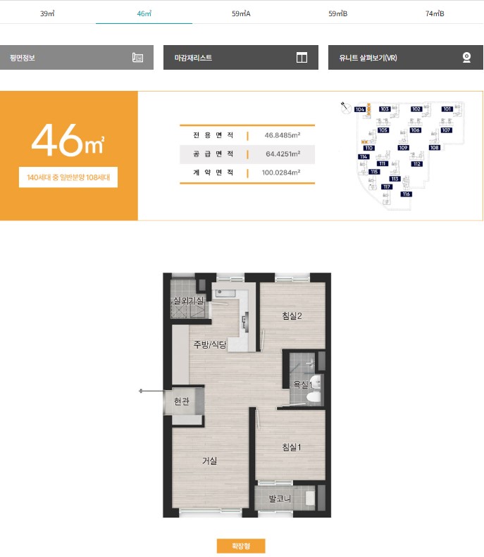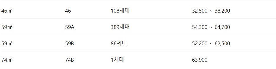 전용면적은 39㎡부터 74㎡까지 다양하게 구성되어 있다.