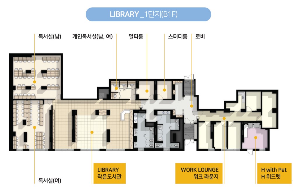 - 작은도서관: 스터디룸과 1인 독서실이 포함된 공간으로, 조용한 학습 환경을 제공.