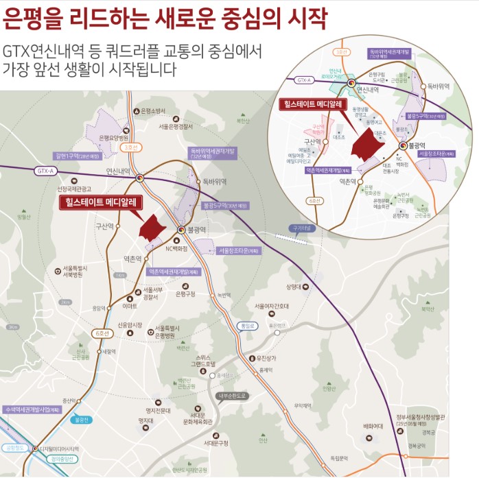 단지는 연신내역(3·6호선, GTX-A), 불광역(3·6호선), 역촌역(6호선), 구산역(6호선) 등 4개 지하철역과 인접해 있어 뛰어난 교통 접근성을 자랑합니다. 특히, GTX-A 노선의 연신내역이 개통되어 서울역까지 약 6분, 향후 수서역까지의 이동 시간도 대폭 단축될 예정.